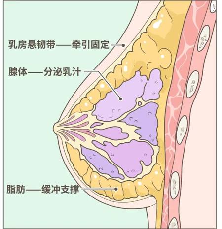 首先我们可以看看乳房的构造,乳房一般由脂肪和乳腺组成。