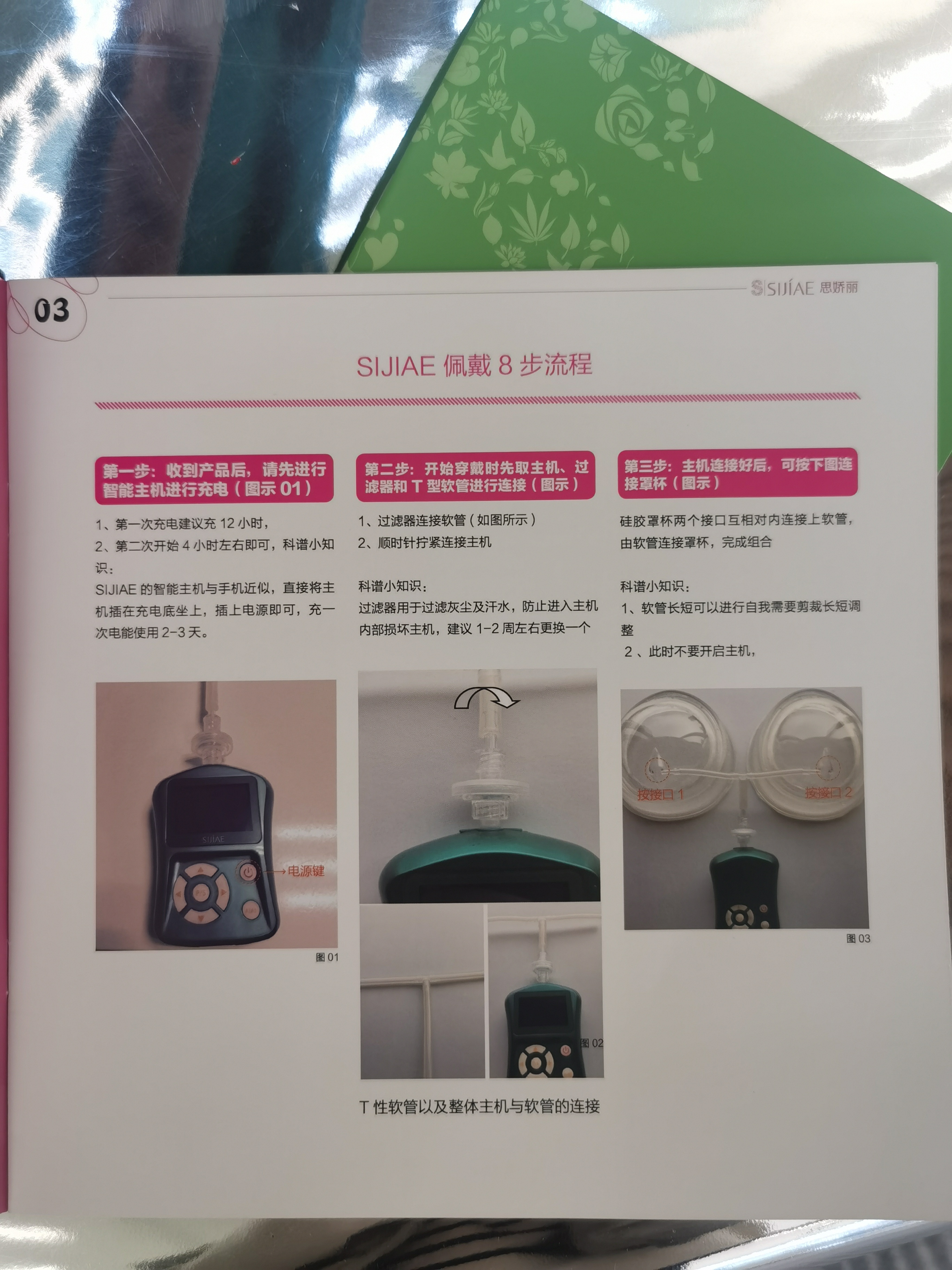 1.每天配戴以前,用SIJÍAE清洁液和温水清洗乳房及其周围皮肤,待皮肤完全干燥后将球体戴上去。